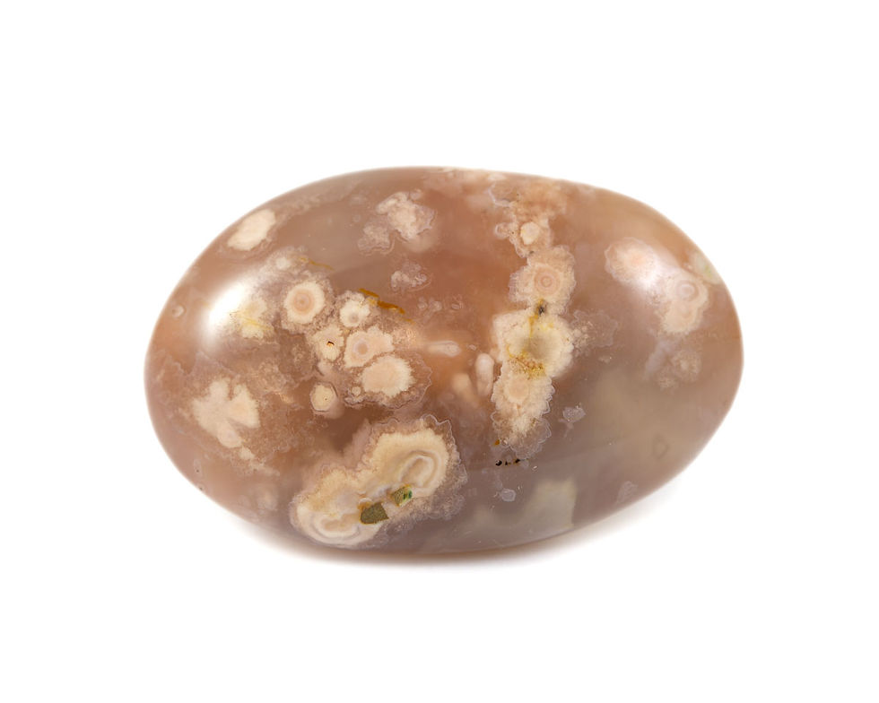 L'agate fleur est une nouvelle découverte de Madagascar. C'est un type d'agate plume, les plumes (ou fleurs) dans l'agate ressemblent à des fleurs de cerisier dans un arbre. La tonalité varie du laiteux au clair avec une couleur rose clair à abricot.